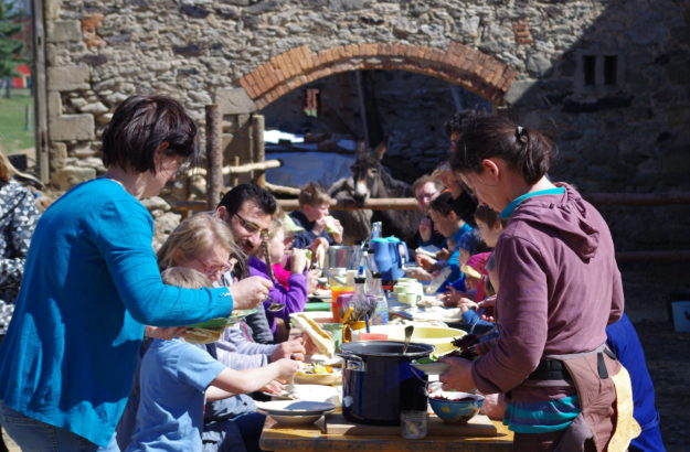 Menschen verschiedener Generationen und Länder treffen sich auf einem Bauernhof um gemeinsam aktiv zu sein.