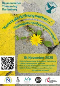 Wir freuen uns darauf, am 19. November 2025, dem Buß- und Bettag, in Marienberg den Ökumenischen Thementag zu Gerechtigkeit, Frieden und Bewahrung der Schöpfung zu begehen. Das Motto des Tages lehnt sich an die vorausgehende Friedensdekade an: „Kommt die Hoffnung wecken“. Los geht’s mit einem ökumenischen Gottesdienst in der Stadtkirche St. Marien um 10 Uhr. Nach einem kleinen Mittagsimbiss laden am Nachmittag verschiedene christliche Gemeinden und Initiativen zu zahlreichen hoffnungsstiftenden Angebote und Workshops zu Gerechtigkeit, Frieden und Schöpfungsbewahrung ein. Den Abschluss bildet ein Podiumsgespräch unter dem Titel „Pflugscharen zu Schwertern – Wo bleibt die Hoffnung?“.